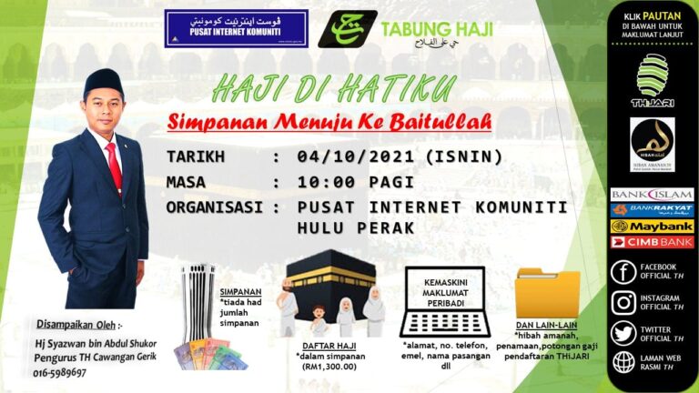 Tabung Haji Cawangan Gerik dengan kerjasama Pusat Internet Komuniti Daerah Hulu Perak telah mengadakan program taklimat yang bertajuk HAJI DI HATIKU: Simpanan Menuju Baitullah. Program ini telah diadakan pada 4hb Oktober 2021, 10:00 – 11: 00 Pagi. Taklimat ini telah disampaikan oleh Tuan Haji Syazwan B. Abdul Shukor selaku Pengurus Tabung Haji Cawangan Gerik. Aplikasi yang digunakan ialah Google Meet.
