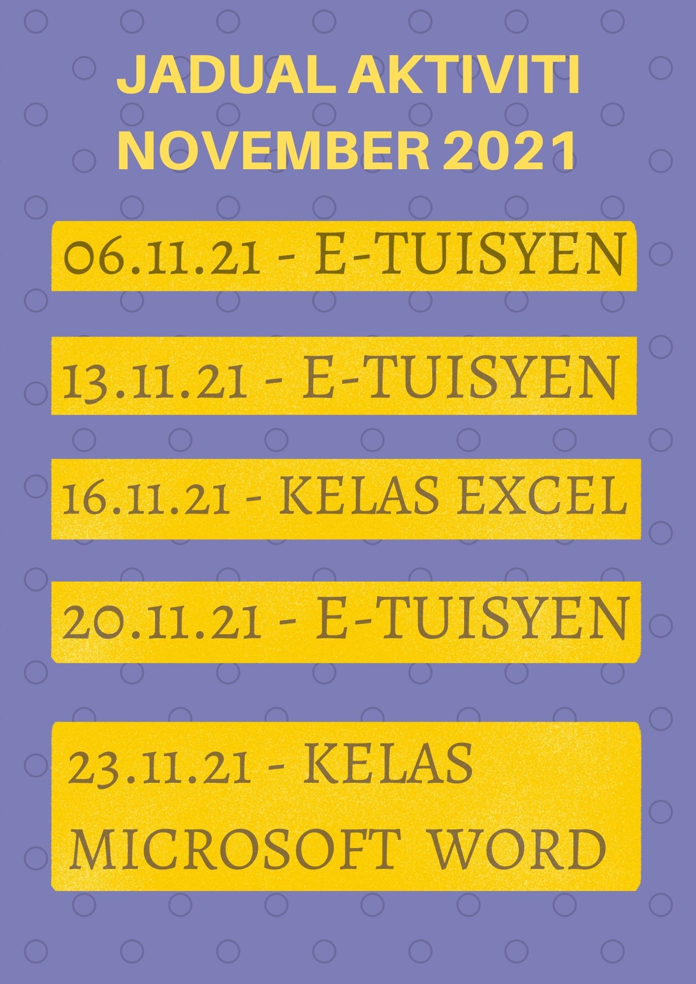 BELAJAR MENGGUNAKAN KOMPUTER SERTA MELAYARI INTERNET Nama: SITI AISYAH BINTI ABDULLAH Umur: 11 Tahun Ahli: 2020 Latar belakang Adik Siti Aisyah adalah seorang pelajar Tahun 5 yang telah menyertai kelas E-Tuisyen Sains di Pusat Internet Komuniti Felda Bersia. Kemudahan internet […]