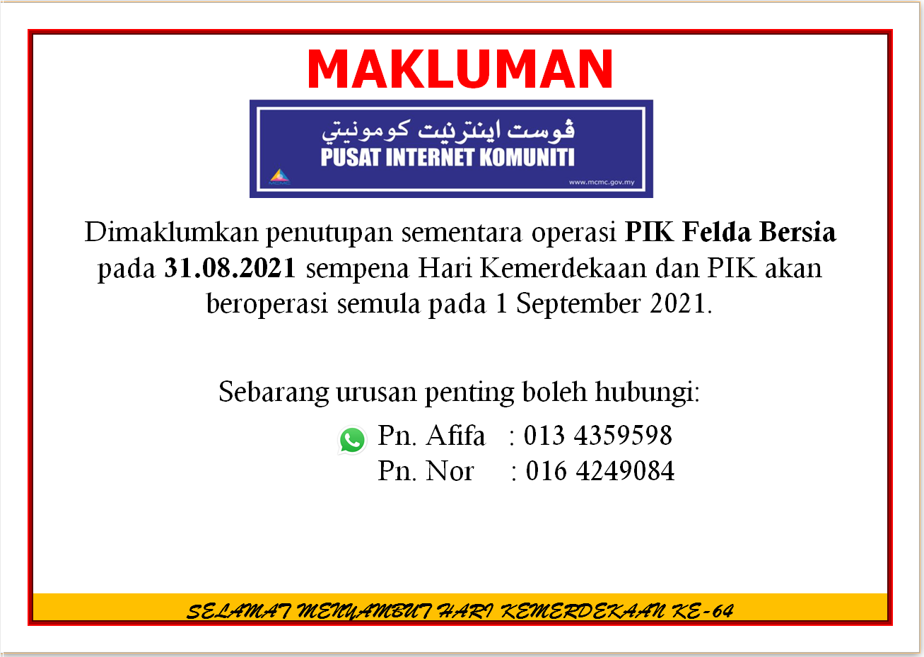 Notis Penutupan Sempena Hari Kemerdekaan Pusat Internet komuniti Felda Bersia